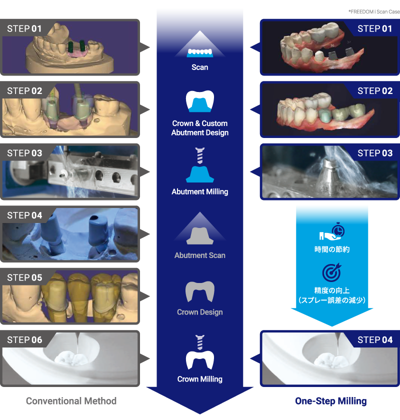 伝統的なカスタムアバットメント制作方式は、アバットメントを先にデザインして加工し、それをもう一度スキャンする複雑な段階を経る反面、ワンステップ加工方式は、カスタムアバットメントと上部補綴物を同時に制作するので、複雑な段階を画期的に減らします。